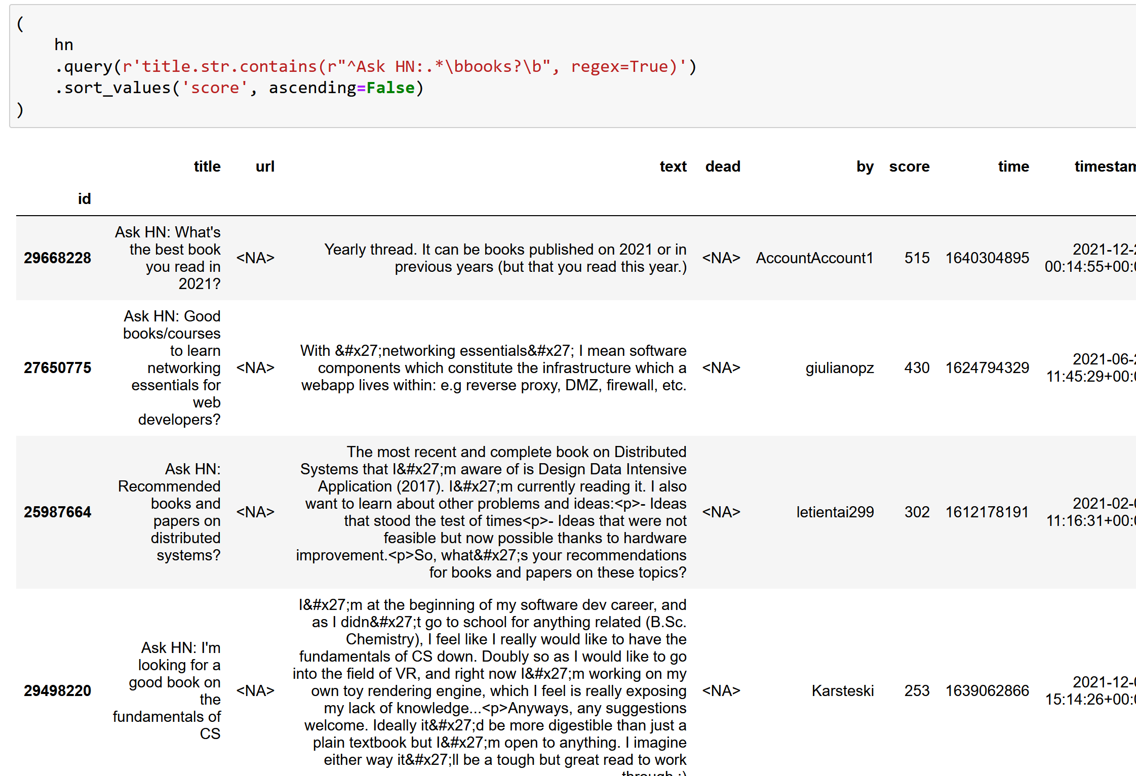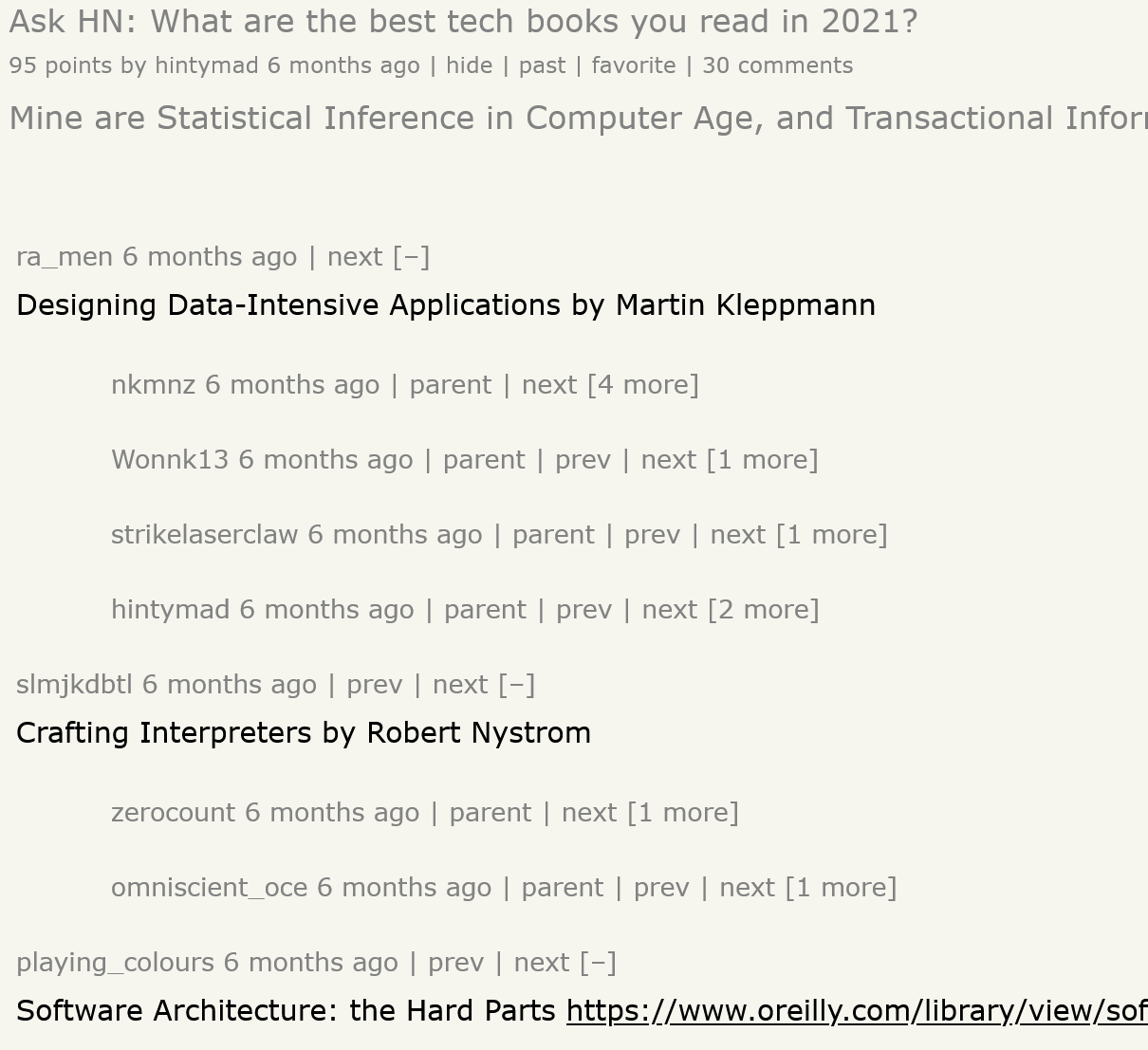 I’m working on a project to extract books from Hacker News. I’ve previously found book recommendations for Ask HN Books, and have used the