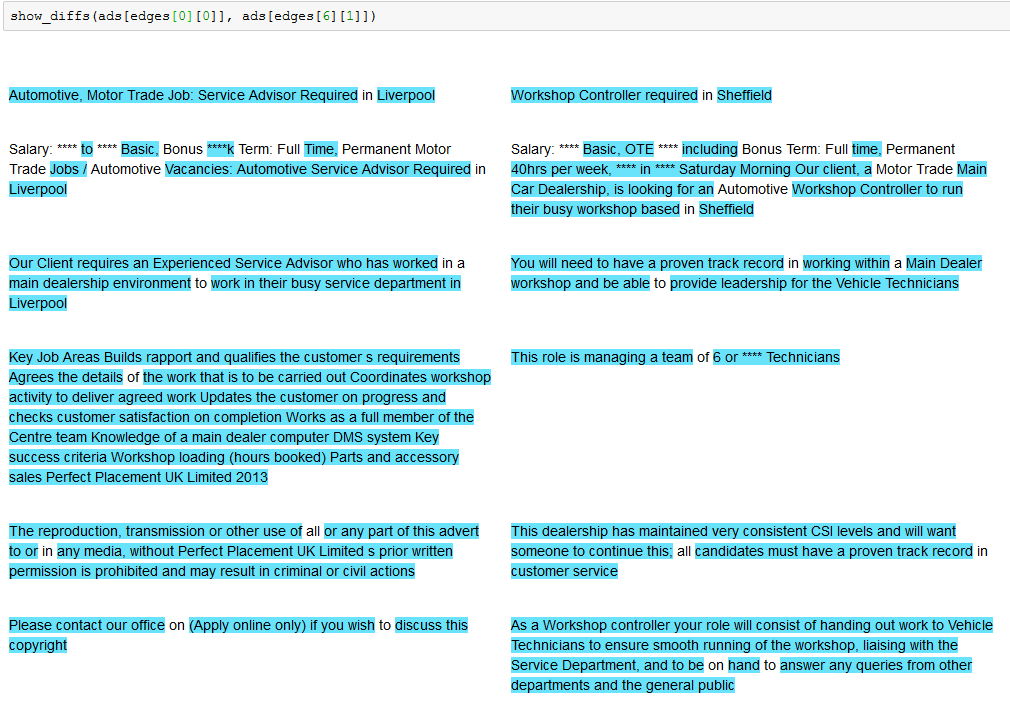 We’ve found pairs of near duplicate texts in 400,000 job ads from the Adzuna Job Salary Predictions Kaggle Competition. When we tried to extracted groups of similar ads by finding connected components in the graph of similar ads. Unfortunately with a low threshold of similarity we ended up with a chain of ads that were each similar, but…