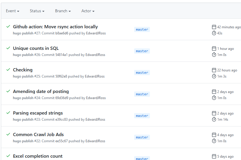 I have been publishing this website using Github Actions with Hugo on push and on a daily schedule. I recently received an error notification via email from Github, and wanted to check whether it was an intermittent error. Unfortunately I couldn’t find anyway to rerun…
