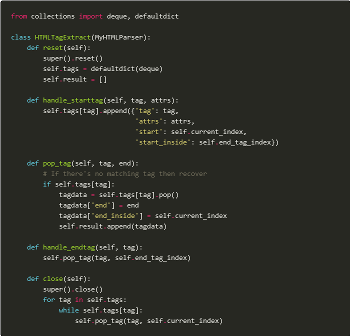 When using NLP in HTML it’s useful to extract the HTML tags which change the meaning of the text. I’ve already shown how to source map the text of HTML using Python’s inbuild HTMLParser. We’ll now adapt this to the task of getting the tags, which could be…