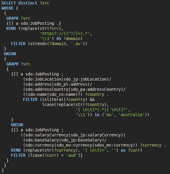 I am trying to extract Australian Job Postings from Web Data Commons which extracts structured data from Common Crawl. I previously came up with a SPARQL query to extract the Australian jobs from the domain, country and currency. Unfortunately it’s quite slow, but we can speed it up dramatically by replacing it with a…