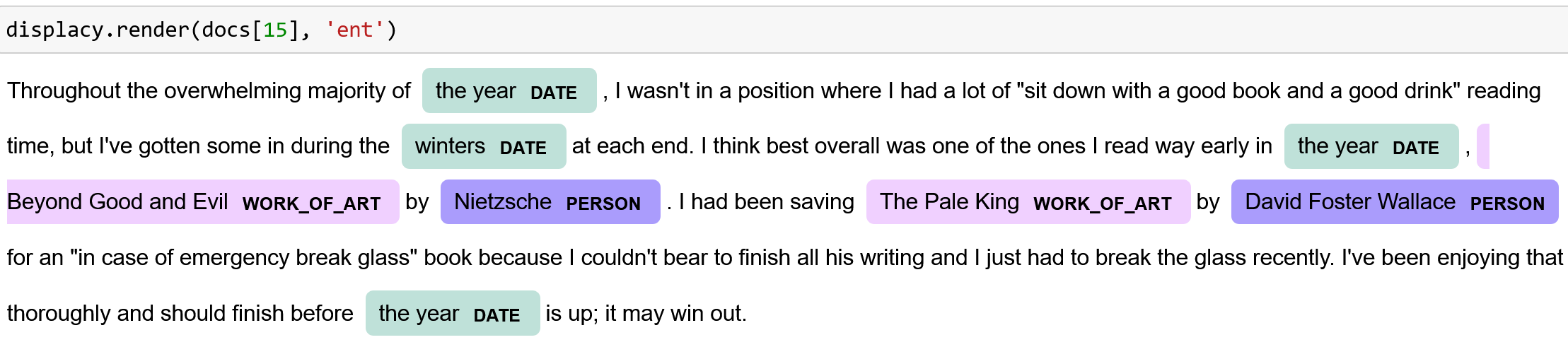 Work of Art named entity from Ontonotes to detect the titles. Another approach is to use extractive question answering as a sort of zero-shot NER. This works amazingly well, at least…